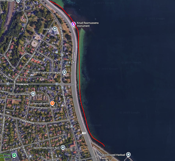 - Knud Rasmussen statuen – Hele strækket kan holde fisk, jeg starter typisk ved Skovshoved havn og fisker op og forbi statuen, generelt har jeg et godt tempo på indtil jeg mærker kontakt, revet ved statuen får gerne lidt ekstra opmærksomhed. Bonus info, på dette stræk kan du også fange torsk fra kysten, men husk de er fredet.